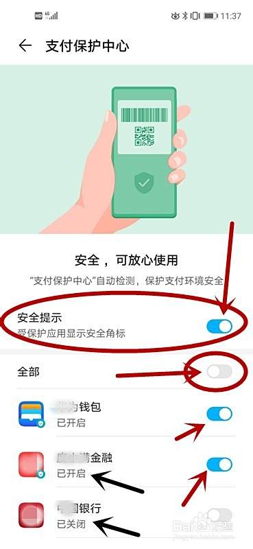 在这里,你可以根据自己的需求进行设置,可以“关闭安全提示”,也可以选择单个的APP软件进行关闭,也可以选择“全部”关闭或开启。