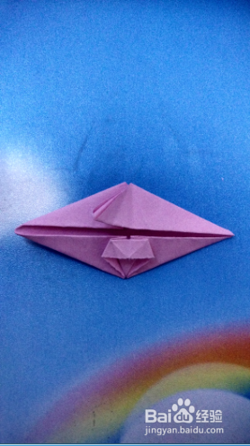 第三步,这一步就是需要细心,耐心哦,,看图片跨度有点大呢,把图三中间凸出来的部分立起来,让它变成立体的梯形,这个需要很细心,大家稍微摸索一下就可以折出来哦。