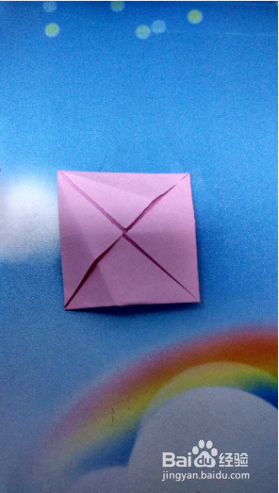 第一步就是把正方向的纸四个角向中心靠拢,然后反过来折成如下图的样子。