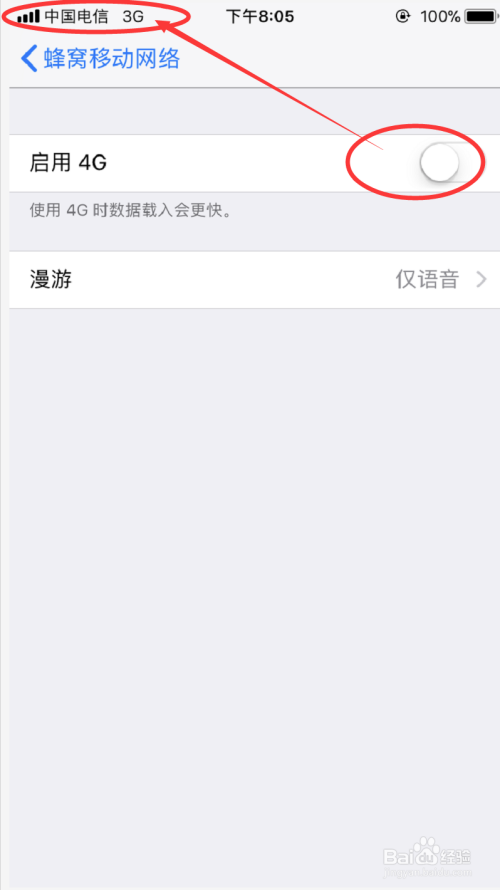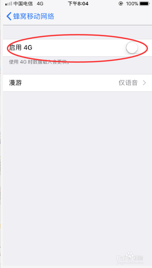 然后在蜂窝移动网络找到蜂窝移动数据选项点击进入把4G网络关闭切换成3G网络,有时候网速会更快些,本人经常这样切换;
