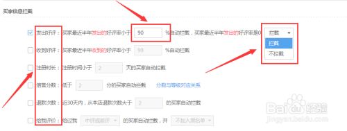 设置根据买家信息拦截条件:这里包括买家发出的好评率,收到的好评率,注册时长,信誉分数,退款次数,以及层级给过本店的评价等。具体信息可以根据店铺客户群进行设置。