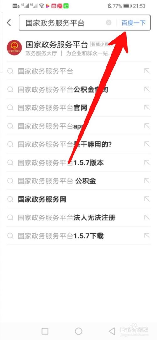 然后去点击搜索框,并在搜索框中输入【国家政务服务平台】,再去点击右上方的“百度一下”进行搜索即可。