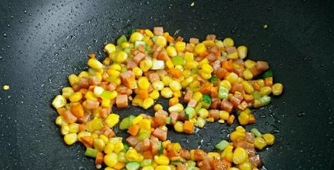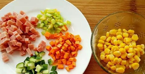 首先把甜玉米粒洗净备用,其它食材切成小丁。