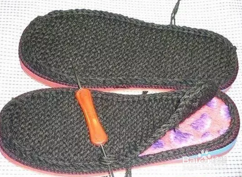 鞋垫打好后,用钩针同鞋底上的短针连接。