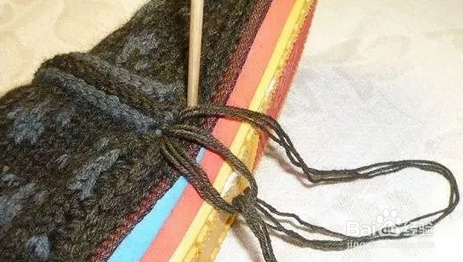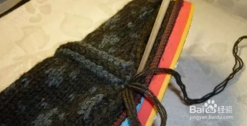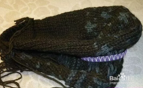 按自己需要的长度边织边收针,最后收到7针收尾(余13针时可全打二针并一针)。反面同正面相同织法(5-6针收尾),把松紧带缝好后套在正反二层的中间,然后用钩针把正反二面连在一起。