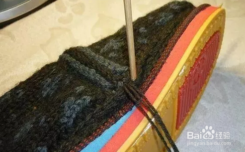 把线拉出后对折(外线比里线长一尺半左右),再用钩针把里线带出。把外线穿过去,里线带紧。重复操作后,鞋面就上好了。