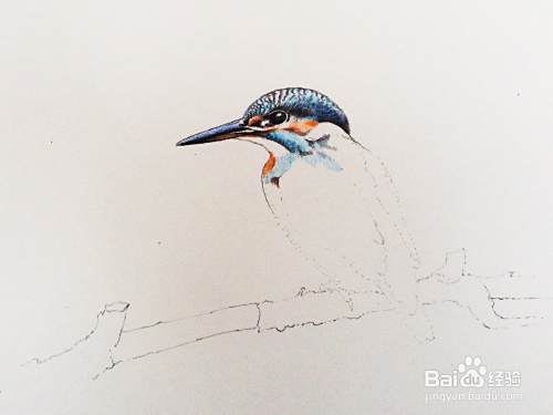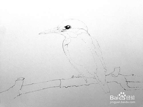 1.首先用0.5的自动铅笔起稿,勾画出翠鸟的基本轮廓与结构。为什么要选用自动铅笔呢?因为自动铅笔笔迹轻盈,易修改,便于我们保持画面的整洁性。