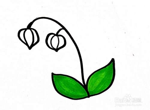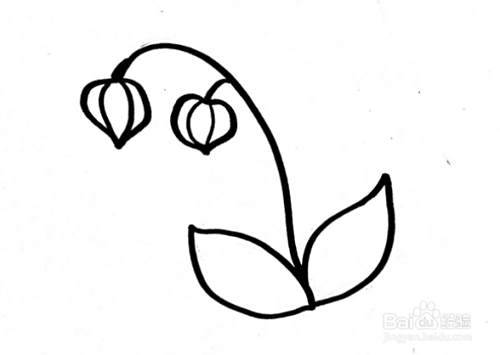 然后从两片叶子中间画出一条向左边弯曲的弧线作为草茎,并且在顶端画出灯笼形状的小果子,在距离顶端不远的茎上画第二个灯笼果。