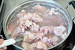 葱姜切片,和清洗干净的羊肉块一起放入锅中;