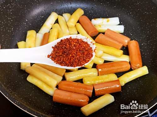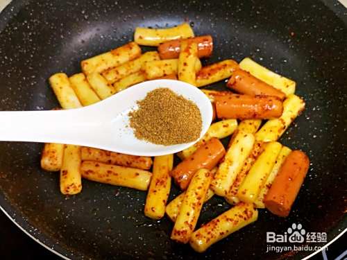 放入半勺孜然粉,这个一定要放呀,孜然粉是本道小吃自然年糕的精髓所在,半包年糕的话半勺孜然粉就够啦。