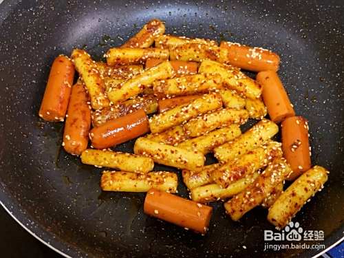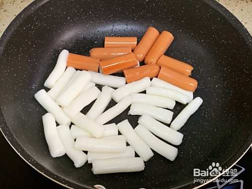 锅里放一点食用油,放入年糕煎至微黄。也可以放入自己喜欢的食物,这里我放的是火腿。