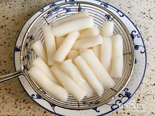 买来的年糕放入沸水中煮熟捞出,如果买来的是一整块可以提前切成小块,捞出后用凉水泡一会儿沥干水分。