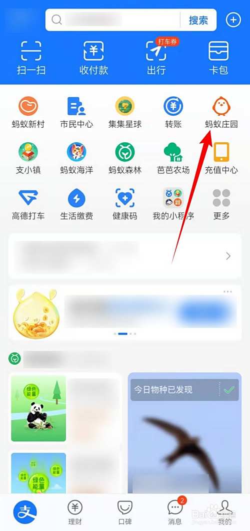 打开支付宝首页,各种生活服务及游戏,选择蚂蚁庄园;