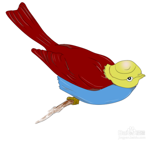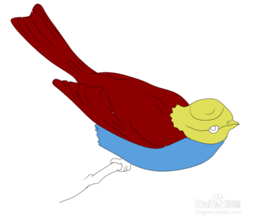 选用黄色涂到小鸟的头部,青色涂至腹部,背部用褐色涂上。如图所示。