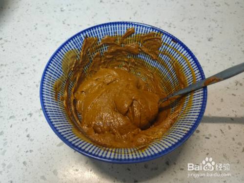 把40克芝麻酱放在碗中,先加入20克香油搅拌,然后再加入适量清水继续搅拌,把芝麻酱稀释成稍稠的酸奶糊状。