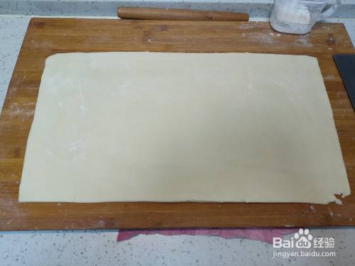 面团醒发好以后取出,放在案板上进行揉面排气,然后擀成0.2厘米厚度的薄片。
