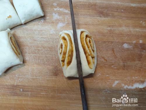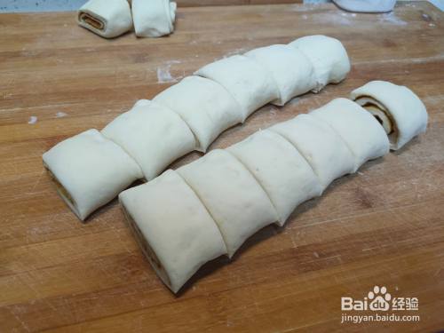 把涂抹上芝麻酱的面片从下向上卷起来,收口捏合,然后切成若干个小剂子。