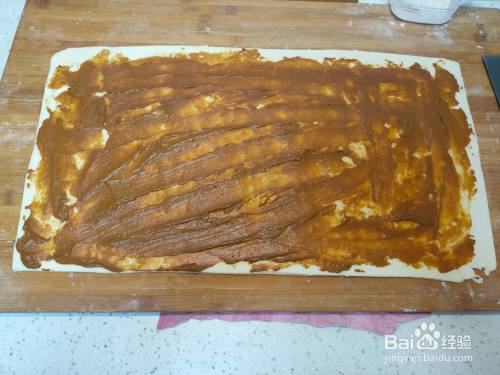 把稀释好的芝麻酱均匀地涂抹在擀开的面片上,在表面均匀地撒少许食用盐。
