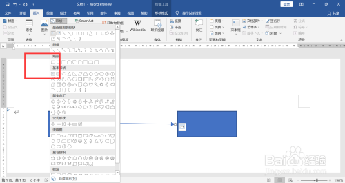 打开WORD文档,点击菜单栏上”插入-形状“,下拉选择箭头插入。