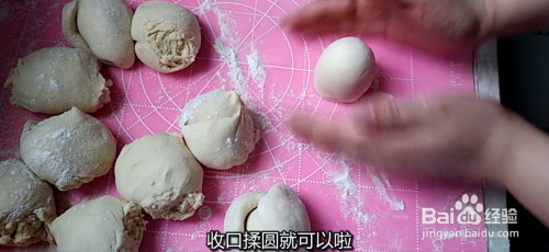 然后开始揉馒头,多揉一会儿,揉到面发软,收成馒头形状,馒头生胚就做好了;