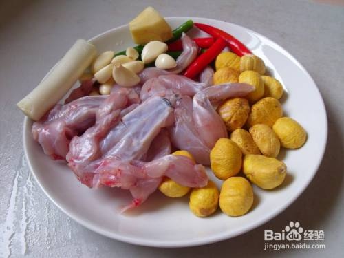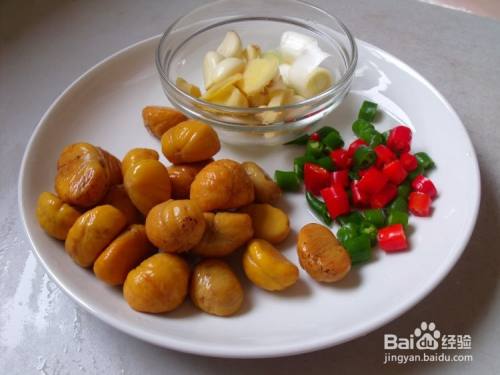 把板栗煮熟后用冷水冲洗一遍,把姜切成片,青红尖椒切成小圈