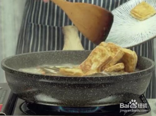 等油温6成热时放入豆腐,小火煎5分钟,翻过另一面煎,煎好后捞起备用。