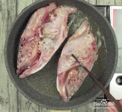 把鱼头剁半,放入盘中,盐,胡椒粉,腌制10分钟。