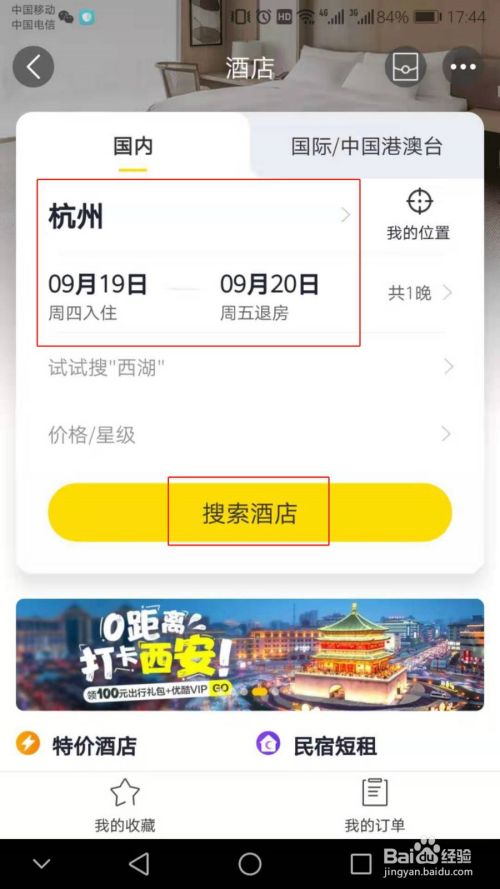 然后填写入住城市和入住时间,然后点击【搜索酒店】。