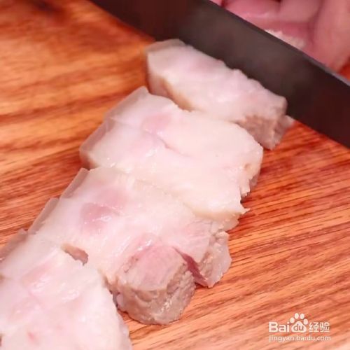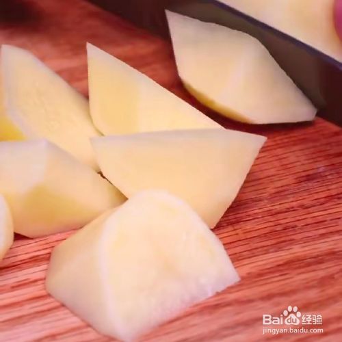 焯好水的五花肉切小块。再准备土豆一个,切滚刀块。备用。