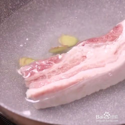 准备一条五花肉,凉水下锅,加适量姜片、料酒。煮出血末。