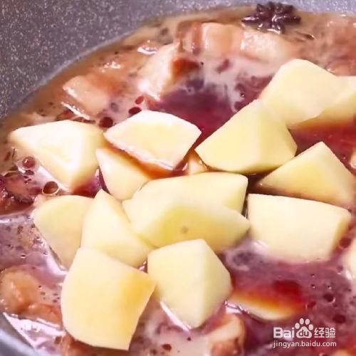 放上煎好的土豆。盖盖子炖至汤汁快干。