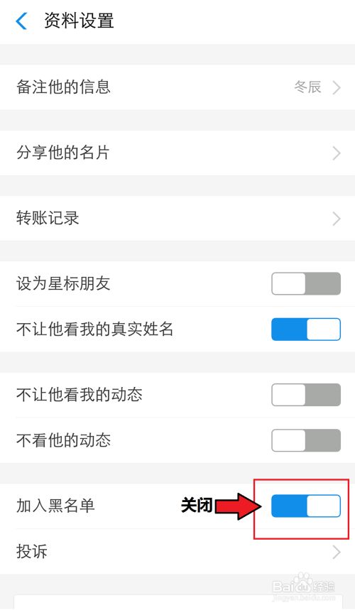 进入资料设置页面,关闭【加入黑名单】。