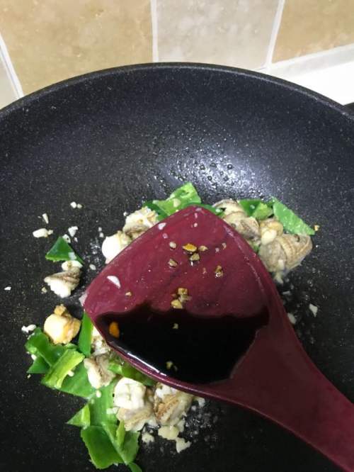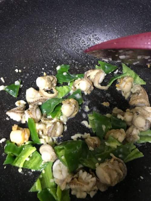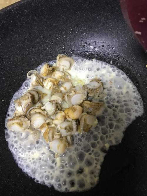 6放入扇贝肉,加少许水,翻炒大概两三分钟左右