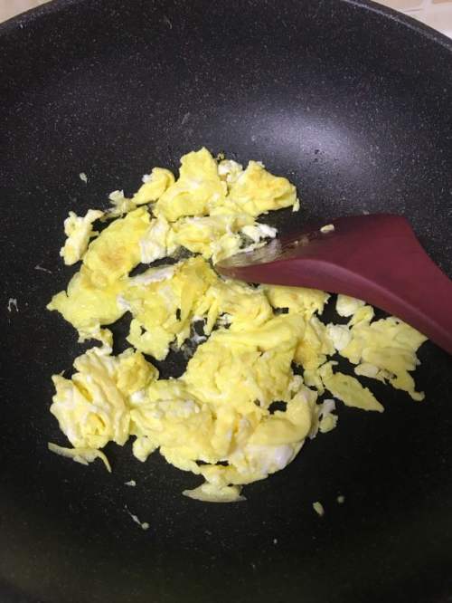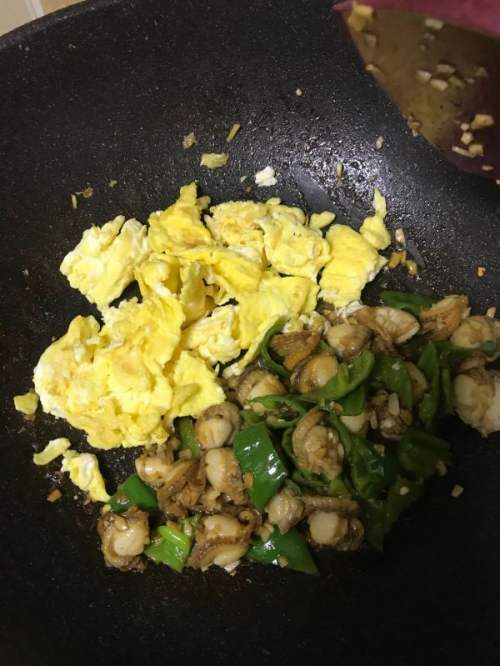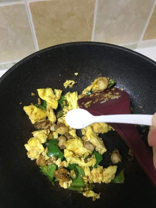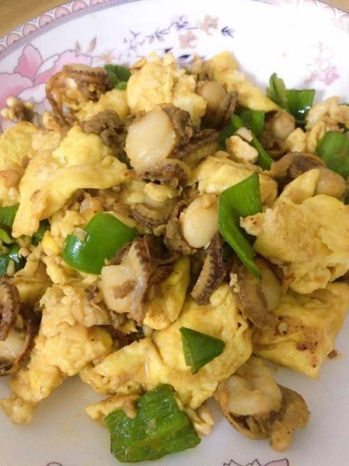 家里没有姜了,有的话腌制扇贝肉的时候可以放两片。鸡蛋炒八分熟即可,口感会比较嫩。
