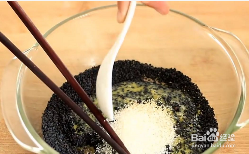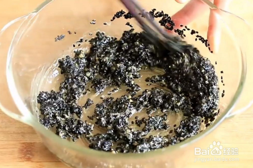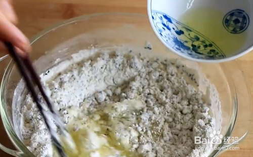在搅拌好的芝麻里加入2勺面粉。然后放入蛋清【不用加水】一边加蛋清一边搅拌。