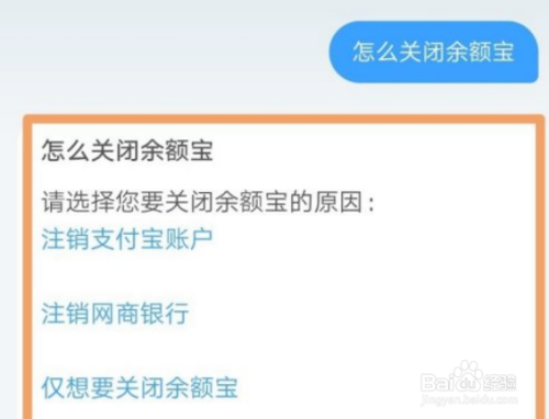 在搜索框中输入怎么关闭余额宝并搜索,选择关闭余额宝的原因。
