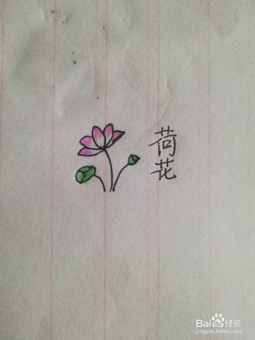 在两侧分别画出一个荷叶和一个花苞,将荷花的上半部分涂成粉色荷叶涂成绿色,这样一个漂亮的荷花就完成了。