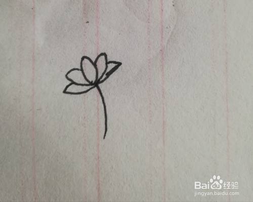 首先我们在白纸上画出一条曲线,曲线的两端微微的翘起形成一个花瓣的轮廓,然后我们再用一条曲线来将这第一条曲线画成一个封闭的图形。