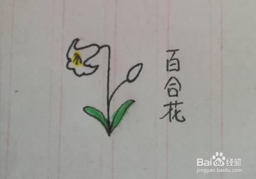 在下方画出一个未开花的花朵和两片叶子,然后我们将花蕊部分涂成黄色,将叶子部分涂成绿色,一个漂亮的百合花就完成了。