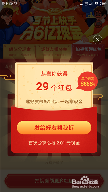 录制完视频后并发布然后即可获得红包,接下来需要分享给好友,点击【发送好友帮我拆】即可获得红包。