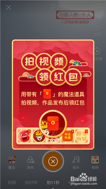 点击后会打开录制界面,拍摄之前会有一个提醒,视频必须使用带红包标准的道具拍摄。