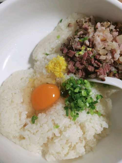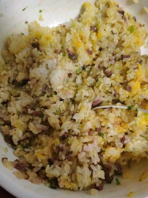 9趁热,打进一颗鸡蛋,葱花,姜沫,腊肉都放进去,带手套抓散开