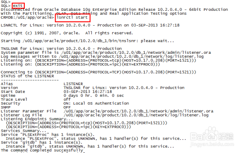 用命令"exit"退出sqlplus。然后用命令“lsnrctl start”启动数据库的监听进程。如图