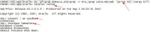 先杀掉所有session,小编用的是命令:“ps -ef|grep $ORACLE_SID|grep -v ora_|grep LOCAL=NO|awk '{print $2}'|xargs kill”也可以用其他办法。然后用sqlplus登录到数据库。命令依次为:“sqlplus /nolog”-“connect / as sysdba” ,最后用命令关闭oracle数据库"shutdown immediate" 。关闭命令的时候需要等待点时间,成功后会有如图的提示。