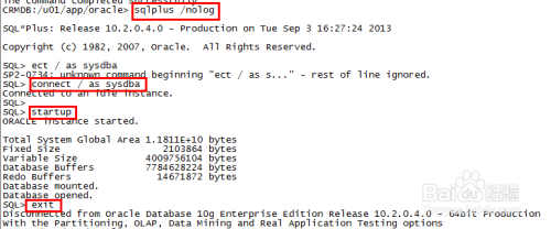 和第三步一样,先用sqlplus登录到数据库。命令依次为:“sqlplus /nolog”-“connect / as sysdba”。然后输入命令“startup”并回车。等待几分钟会出现如图提示信息。最后用命令“exit”退出sqlplus。