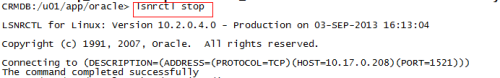 关掉oracle的监听进程:命令为“lsnrctl stop”并回车,这时外部没法连接到数据库了。如图有提示关闭成功信息。