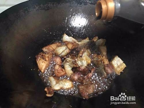 锅中入油放入生姜八角炒香,放入肉翻炒至金黄