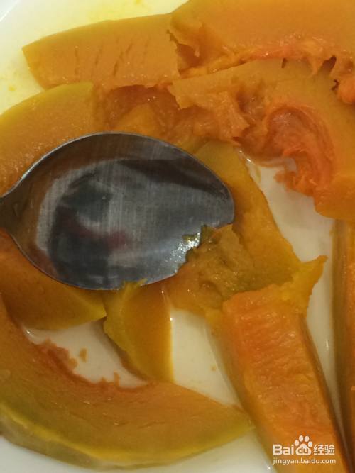 把南瓜去皮切成条,放蒸锅上蒸熟,南瓜用勺子压成泥状