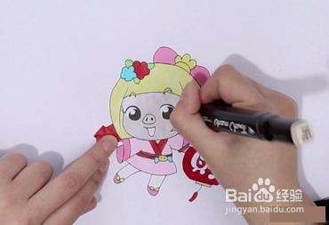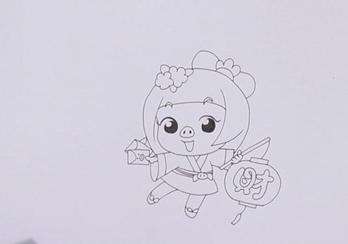 11、首先画出小猪的头部,头上戴着花,脸圆圆的,公主切的头发,非常可爱。