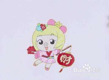 55、给小猪的衣服也涂上粉色,手里的红包和灯笼涂上红色,皮肤涂上肤色。